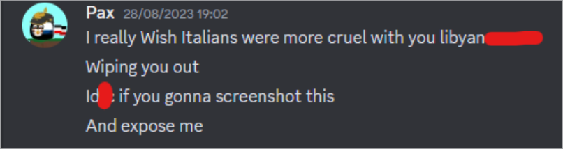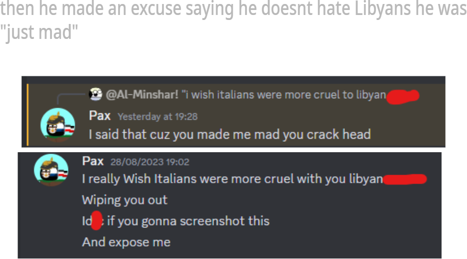 not an excuse for racism, Italy had killed half the population and committed mass genocide. you can't ask for more. soon later planets354 told me that it was a joke, and me and Pax had a fight for absolutely no reason. "JOKE". but me and him are still enemies. and it's his fault. it would be awesome if you guys could help, doing something like call the police (he's in the uk). please download this folder, his italian friend (his name is Pax) and me are fighting alot. and then he said I hate him cuz he's italian, and thats not correct. I hate him because planets354 started a dispute